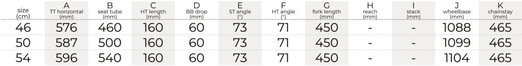 Frame: Alloy 6061, sizes: 46/50/54 cm